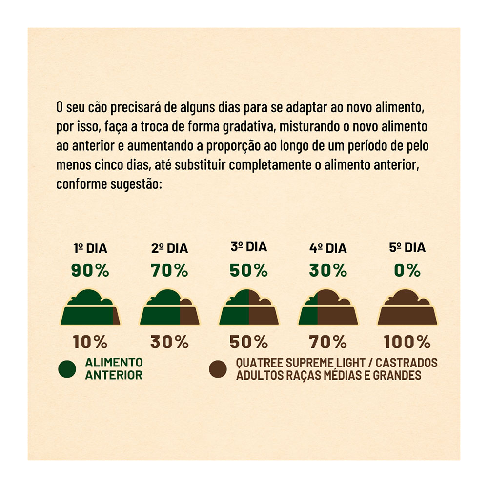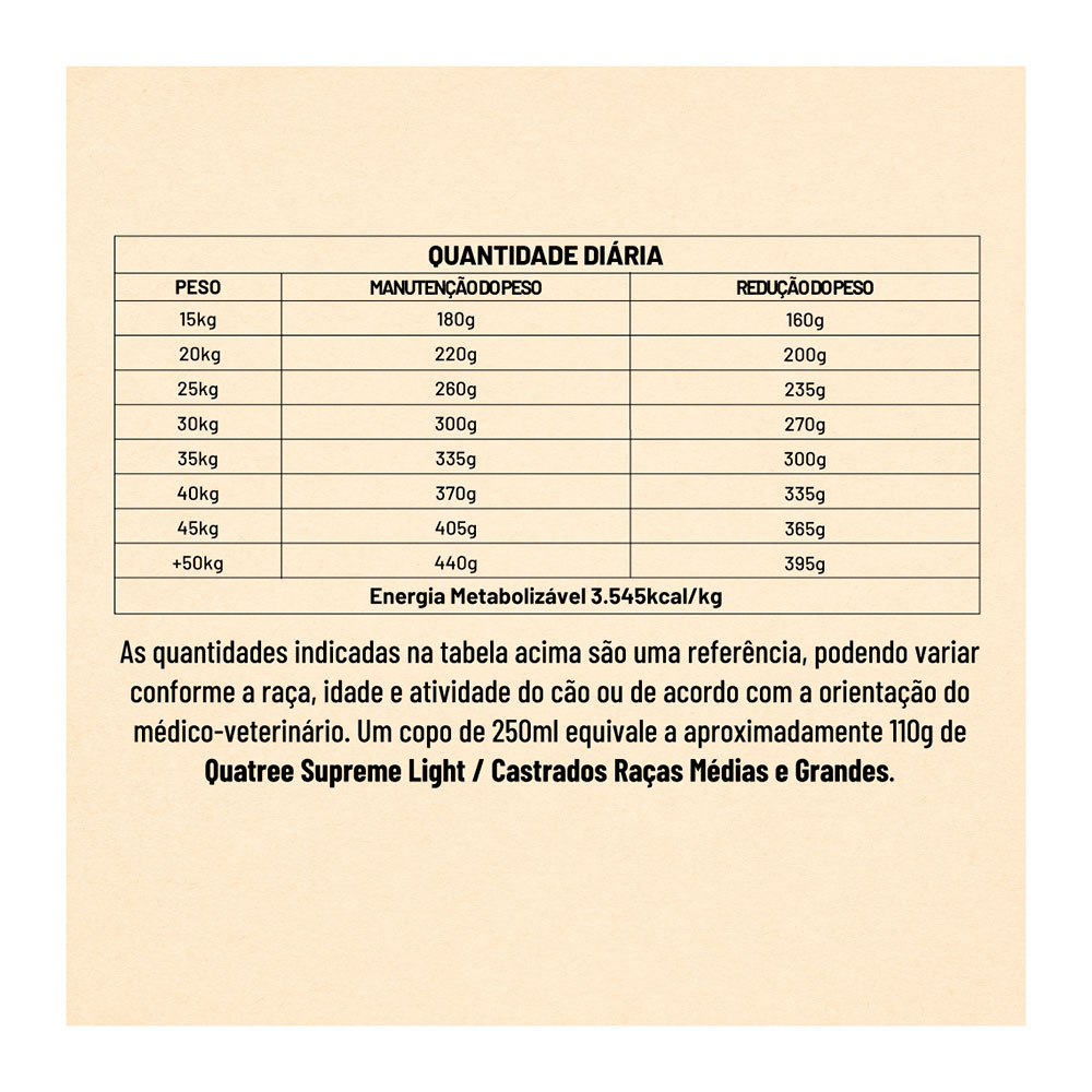 Fornecer diariamente o alimento Quatree Supreme Cães Light de acordo com o peso do animal.