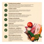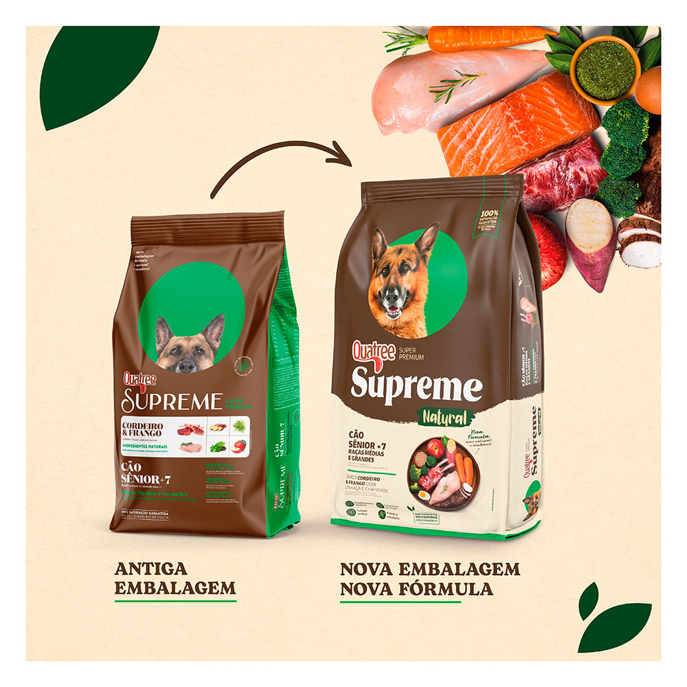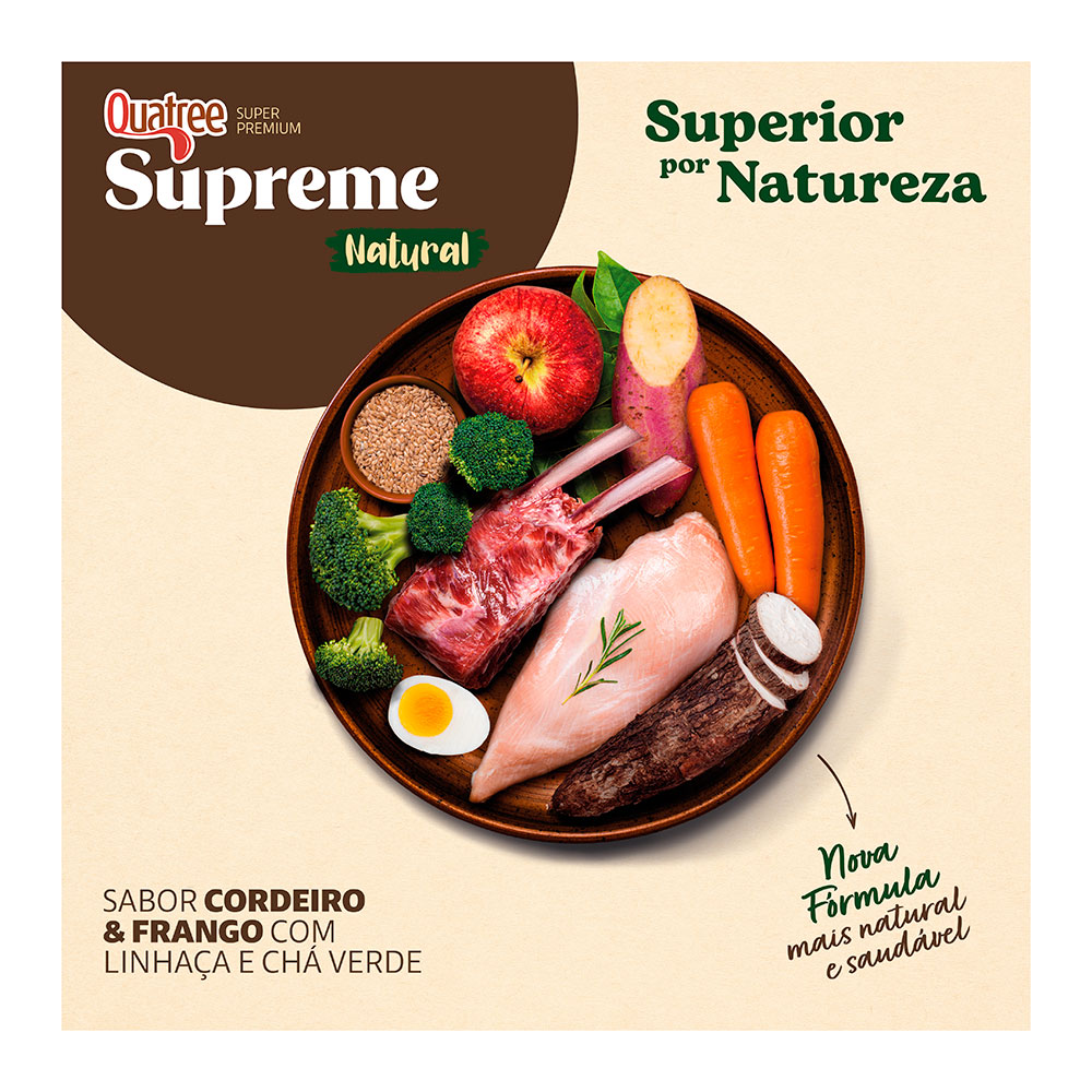 Quatree Supreme Sênior +7 Raças Médias e Grandes contém DHA importante para a saúde do cérebro e melhora do estado cognitivo. Além disso, possui níveis reduzidos de sódio e fósforo para a manutenção dos rins e do coração, auxilia no equilíbrio da flora intestinal com as fibras naturais prebióticas (MOS e FOS), polpa de beterraba e extrato de yucca que asseguram ótima digestibilidade. Contém Ômega 3 e 6, além da maçã e chá verde com potente ação antioxidante que reforça as defesas naturais do organismo.