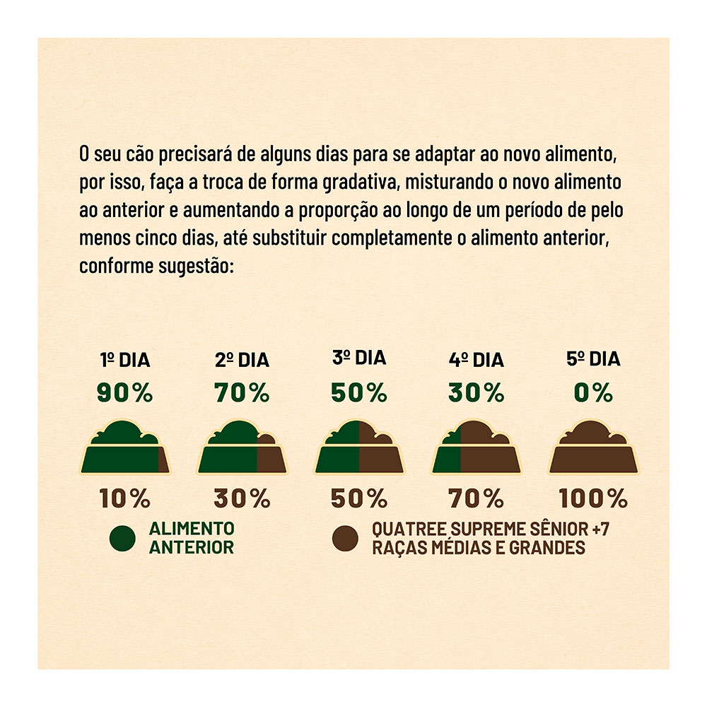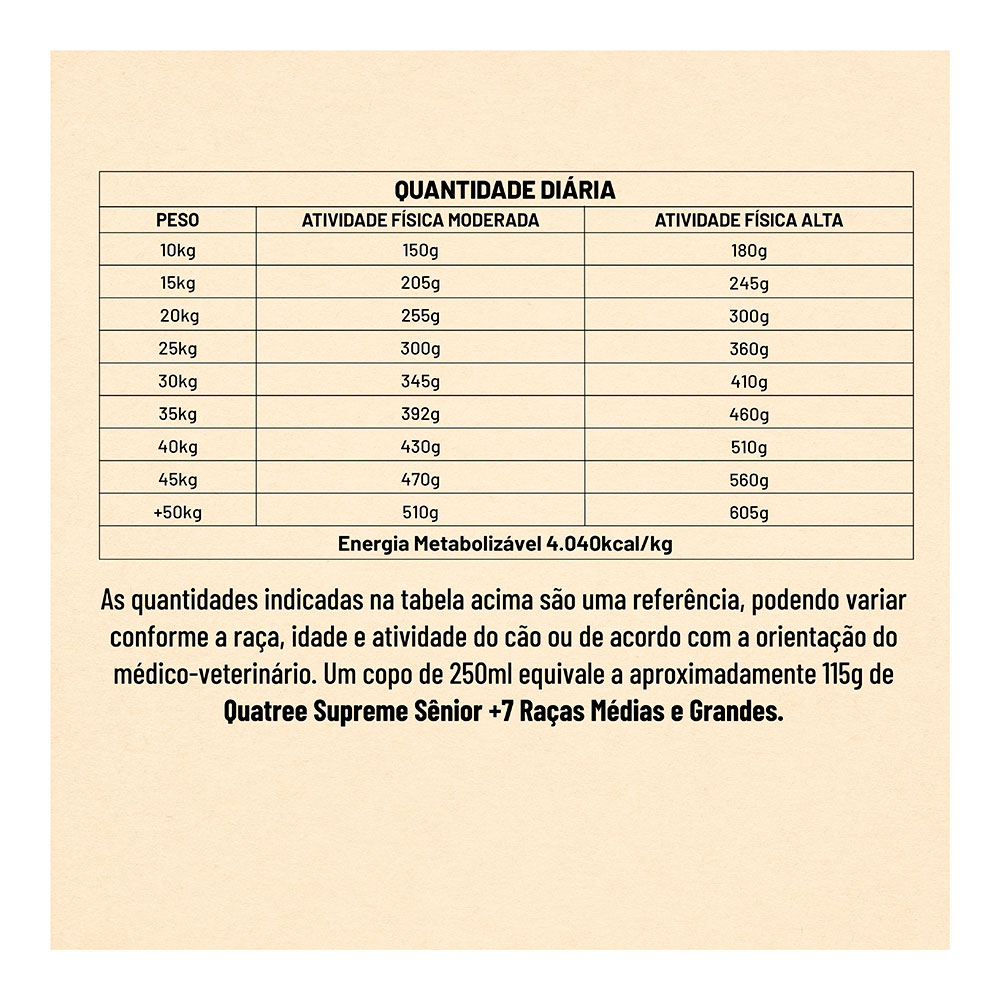 Fornecer diariamente o alimento Quatree Supreme Sênior +7 Raças Médias e Grandes dividido em duas porções.