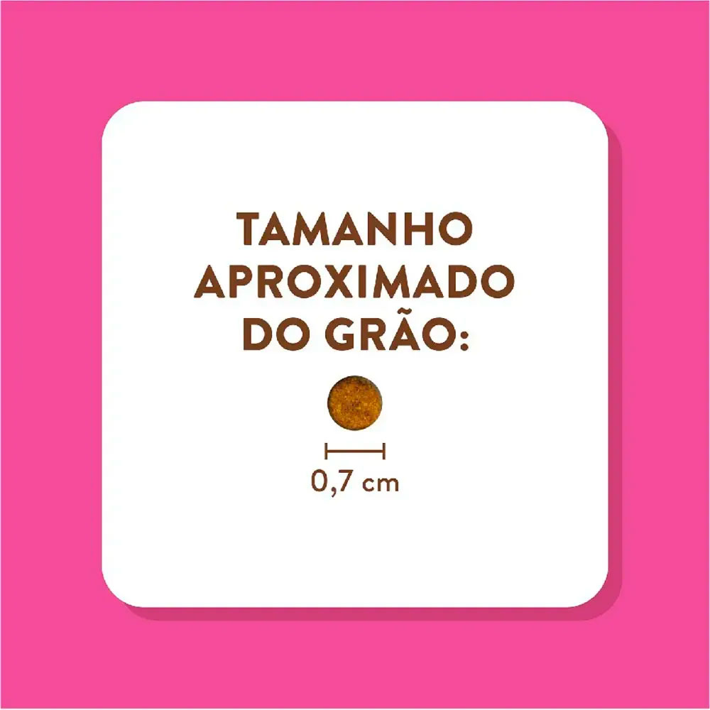 Farinha de vísceras de frango, farinha de torresmo, farinha de salmão (mín. 0,5%), ovo em pó, arroz quebrado, grão de sorgo, farinha de batata-doce (mín. 0,5%), óleo de aves, gordura suína, grão de linhaça, polpa desidratada de beterraba (mín. 1,0%), levedura de cervejaria inativada desidratada, celulose, lignocelulose, inulina (FOS) (mín. 0,15%), mananoligossacarídeo (MOS) (mín. 0,1%), hexametafosfato de sódio (mín. 0,1%), extrato de yucca, zeólita, bentonita, taurina, DL-metionina, lisina, maçã desidratada (mín. 0,05%), extrato de chá verde (Camelia sinenses) (mín. 0,01%), parede celular de levedura (fonte de beta-glucanas 1,3-1,6) (mín. 0,04%), levedura enriquecida com selênio, extrato de alecrim, tocoferol (concentrado), hidrolisado de fígado de aves e suíno, cloreto de potássio, cloreto de sódio, ácido cítrico, ácido fosfórico, vitamina A, vitamina D3, vitamina E, vitamina K3, vitamina C, vitamina B1, vitamina B2, vitamina B6, vitamina B12, niacina (ácido nicotínico), cloreto de colina, ácido fólico, biotina, D-pantotenato de cálcio, sulfato de cobre monohidratado, sulfato de ferro, sulfato de manganês, sulfato de zinco, iodato de cálcio, selenito de sódio, proteinato de manganês, proteinato de selênio, proteinato de zinco.