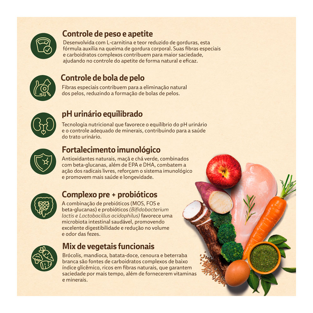 Farinha de vísceras de frango, farinha de torresmo, farinha de peixes, ovo em pó, gordura suína, gordura de aves, arroz quebrado, sorgo integral moído, farinha de batata doce, glúten de trigo, grão de linhaça, polpa desidratada de beterraba (mín. 1,0%), levedura de cervejaria inativada desidratada, celulose, lignocelulose, inulina (FOS) (mín. 0,15%), mananoligossacarídeo (MOS) (mín. 0,1%), cloreto de sódio, cloreto de potássio, hidrolisado de fígado de aves e suíno, hexametafosfato de sódio (mín. 0,1%), ácido fosfórico, parede celular de levedura, zeólita, extrato de yucca, taurina, metionina, lisina, L-carnitina (mín. 0,03%), tocoferol (concentrado), extrato de alecrim, maçã desidratada, extrato de chá verde, acetato de retinol (vit. A), colecalciferol (vit. D3), ácido ascórbico (vit. C), acetato de DL-alfa-tocoferol (vit. E), mononitrato de tiamina (vit. B1), riboflavina (vit. B2), cloridrato de piridoxina (vit. B6), cianocobalamina (vit. B12), bissulfito de menadiona nicotinamida (vit. K3), biotina, cloreto de colina, niacina (ácido nicotínico), ácido fólico, D-pantotenato de cálcio (ácido pantotênico), sulfato de cobre monohidratado, sulfato de ferro, sulfato de zinco, sulfato de manganês, selenito de sódio, iodato de cálcio, proteinato de manganês, proteinato de selênio, proteinato de zinco.