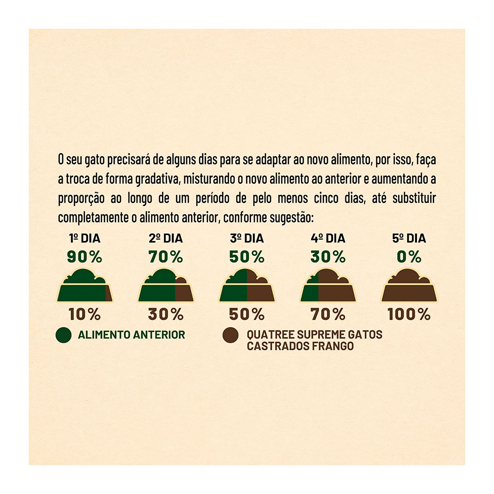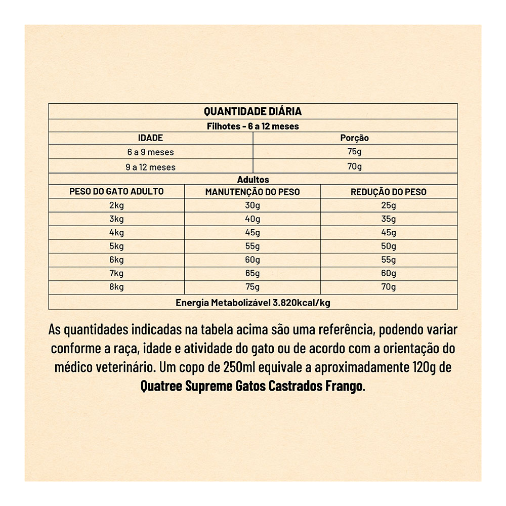Fornecer diariamente o alimento Quatree Supreme Gatos Castrados Frango de acordo com o peso do animal.