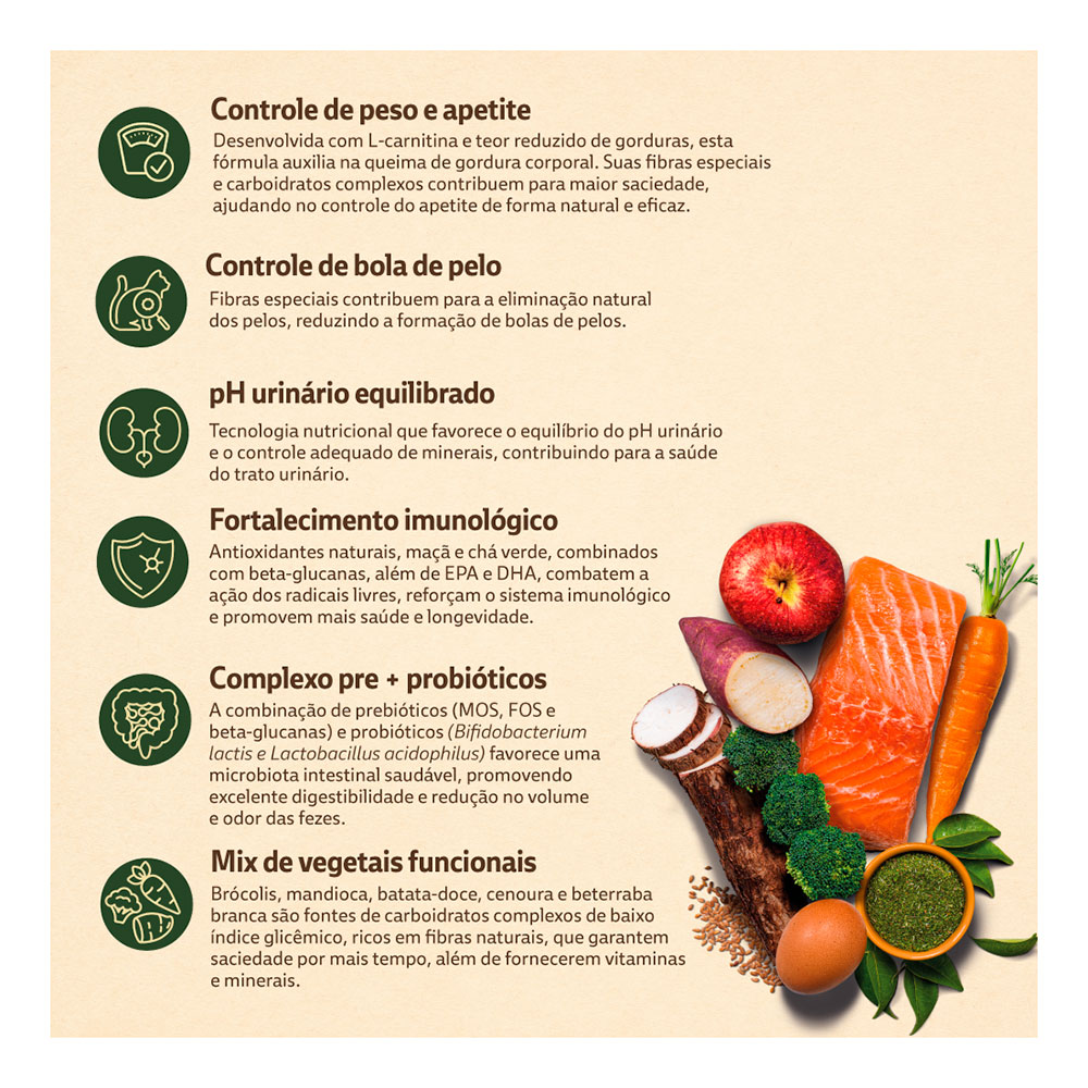 Farinha de vísceras de frango, farinha de torresmo, farinha de salmão, ovo em pó, gordura suína, gordura de aves, arroz quebrado, sorgo integral moído, farinha de batata doce, glúten de trigo, grão de linhaça, polpa desidratada de beterraba (mín. 1,0%), levedura de cervejaria inativada desidratada, celulose, lignocelulose, inulina (FOS) (mín. 0,15%), mananoligossacarídeo (MOS) (mín. 0,1%), cloreto de sódio, cloreto de potássio, hidrolisado de fígado de aves e suíno, hexametafosfato de sódio (mín. 0,1%), ácido fosfórico, parede celular de levedura, zeólita, extrato de yucca, taurina, metionina, lisina, L-carnitina (mín. 0,03%), tocoferol (concentrado), extrato de alecrim, maçã desidratada, extrato de chá verde, acetato de retinol (vit. A), colecalciferol (vit. D3), ácido ascórbico (vit. C), acetato de DL-alfa-tocoferol (vit. E), mononitrato de tiamina (vit. B1), riboflavina (vit. B2), cloridrato de piridoxina (vit. B6), cianocobalamina (vit. B12), bissulfito de menadiona nicotinamida (vit. K3), biotina, cloreto de colina, niacina (ácido nicotínico), ácido fólico, D-pantotenato de cálcio (ácido pantotênico), sulfato de cobre monohidratado, sulfato de ferro, sulfato de zinco, sulfato de manganês, selenito de sódio, iodato de cálcio, proteinato de manganês, proteinato de selênio, proteinato de zinco.
