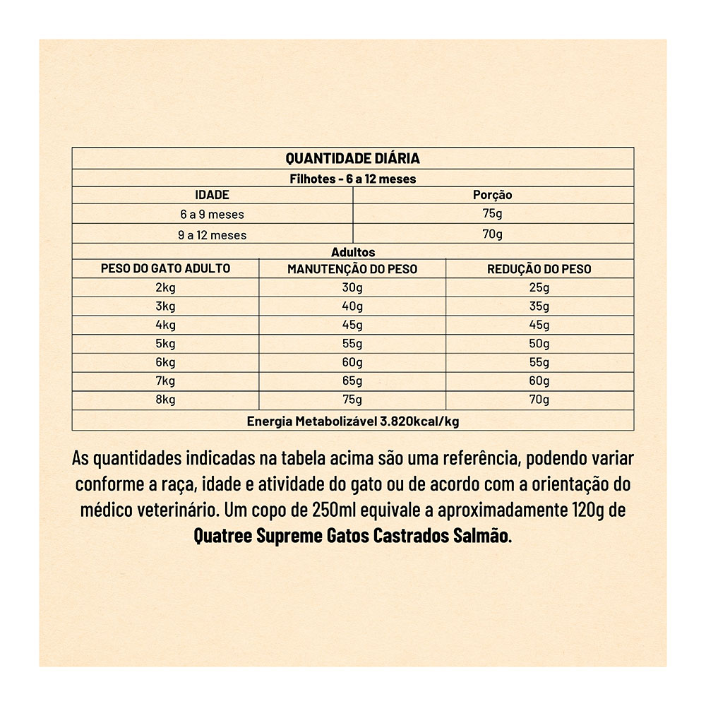 Fornecer diariamente o alimento Quatree Supreme Gatos Castrados de acordo com o peso do animal.