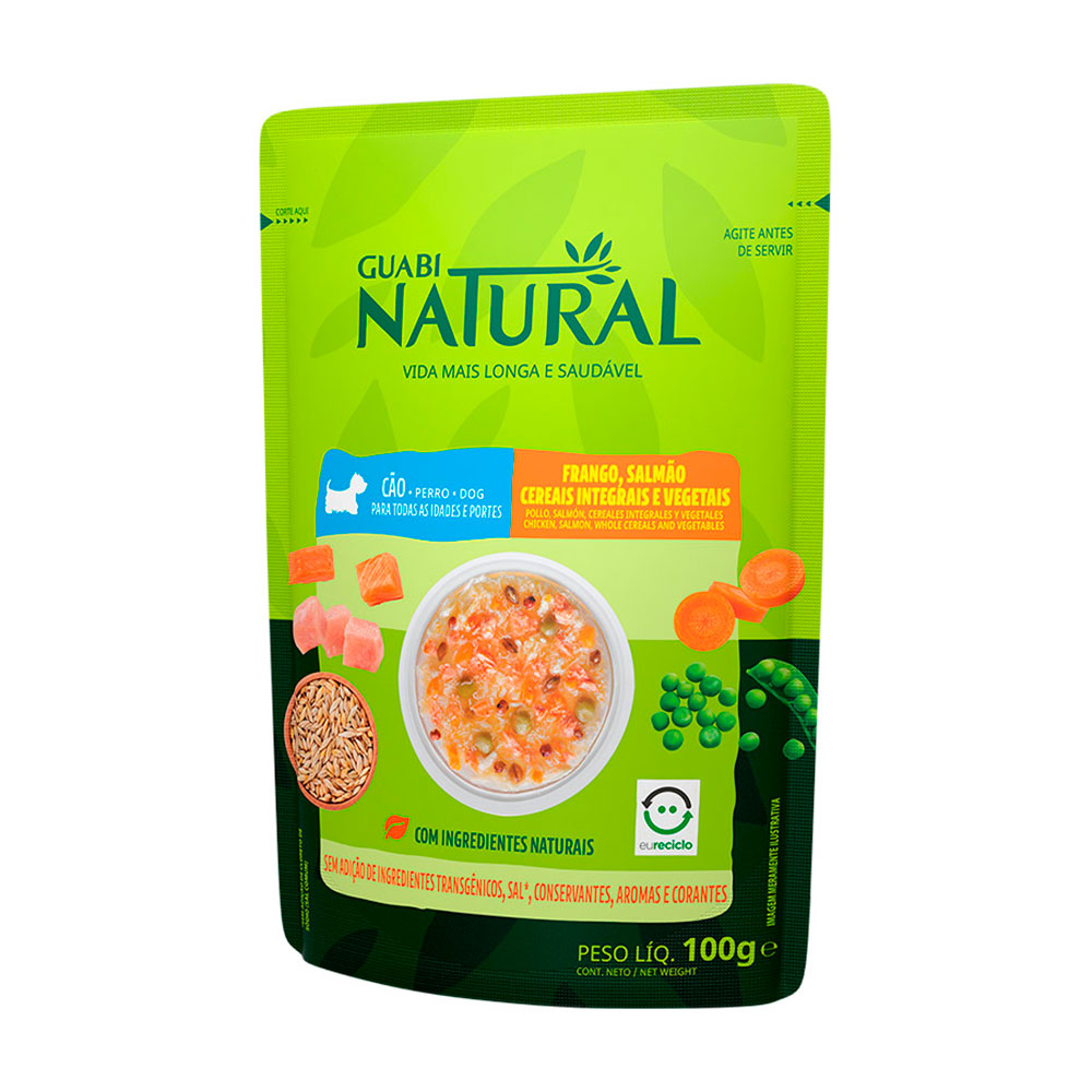 A Guabi Natural Sachê Cães Adultos Frango, Salmão e Cereais é um alimento indicado para cães de todas as idades e portes, sendo 100% natural livre de ingredientes transgênicos, corantes e aromatizantes artificiais.