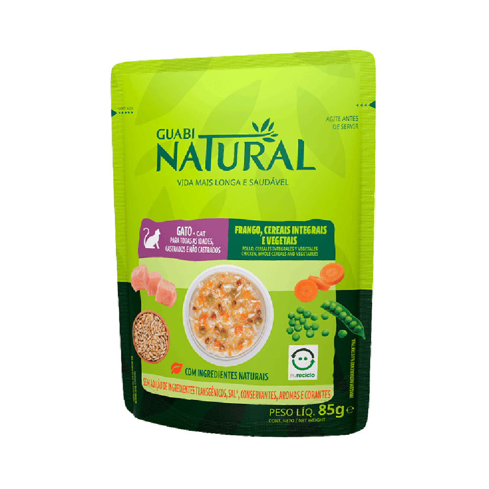 A Guabi Natural Gatos Frango, Cereais Integrais e Vegetais não contém adição de sal, conservantes e aromatizantes artificiais em sua composição, sendo ideal para hidratar os gatos por possuir um índice elevado de umidade.