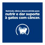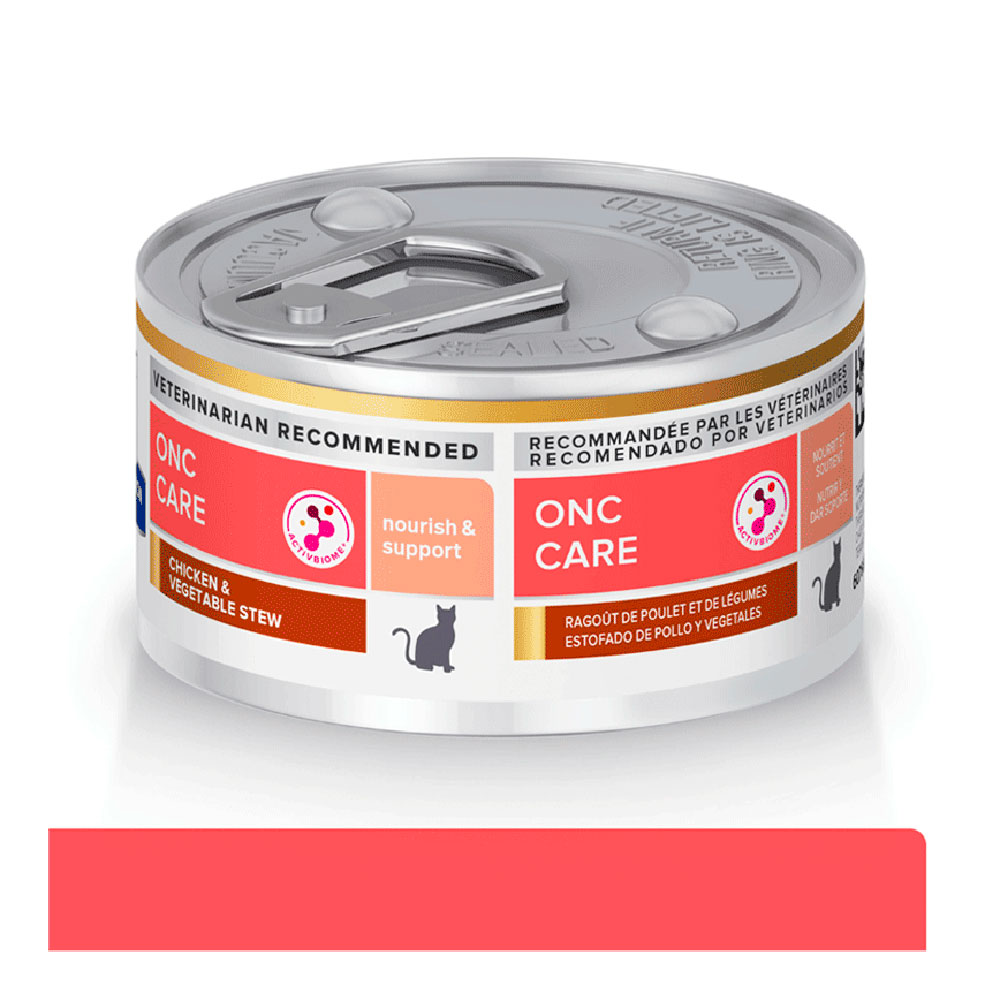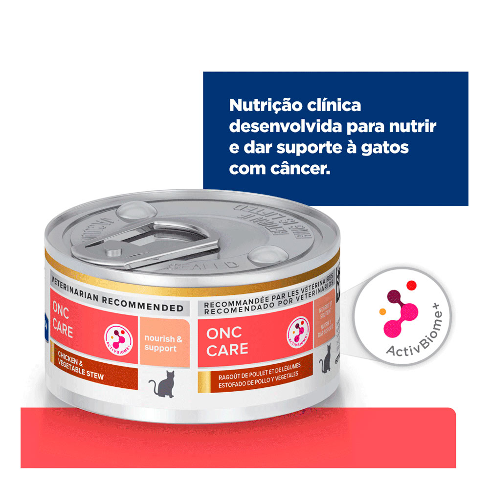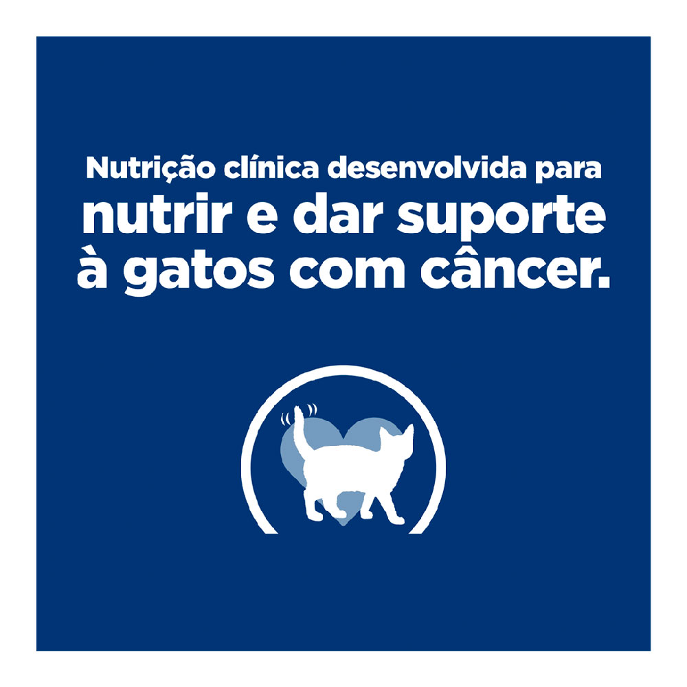 Ração Úmida Hill’s Prescription Diet Gatos ONC Care um alimento coadjuvante úmido, indicado para o suporte nutricional de gatos adultos com câncer e secundariamente, contra anorexia, perda de peso causada pela caquexia, debilidade e má nutrição em estados de convalescença, estados hipermetabólicos, e cirurgia (pré e pós).