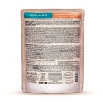 Farinha de salmão, carne mecanicamente separada de aves, cabeça de frango, dorso de aves, fígado de suíno, plasma sanguíneo desidratado de suíno, gelatina, farinha de batata doce, fibra de mandioca, farinha de trigo, amido modificado de milho, dextrose, proteína isolada de soja, proteína texturizada de soja, óleo de aves, biomassa de microalgas desidratada (Schizochytrium sp.), celulose, levedura de cana-de-açúcar hidrolisada e desidratada, extrato de Yucca schidigera, subproduto da extração da L-cistina, cloreto de sódio, carbonato de cálcio, cloreto de potássio, água, glicina, cloridrato de L-cisteína monohidratado, DL-metionina, taurina, vitamina D3, vitamina E, vitamina K3, vitamina B1, vitamina B2, vitamina B6, vitamina B12, vitamina C, niacina, cloreto de colina, ácido pantotênico, ácido fólico, biotina, iodato de cálcio, cobre aminoácido quelato, ferro aminoácido quelato, manganês aminoácido quelato, zinco aminoácido quelato, goma guar, carragena, tripolifosfato de sódio, extrato de urucum, cúrcuma (Curcuma longa).