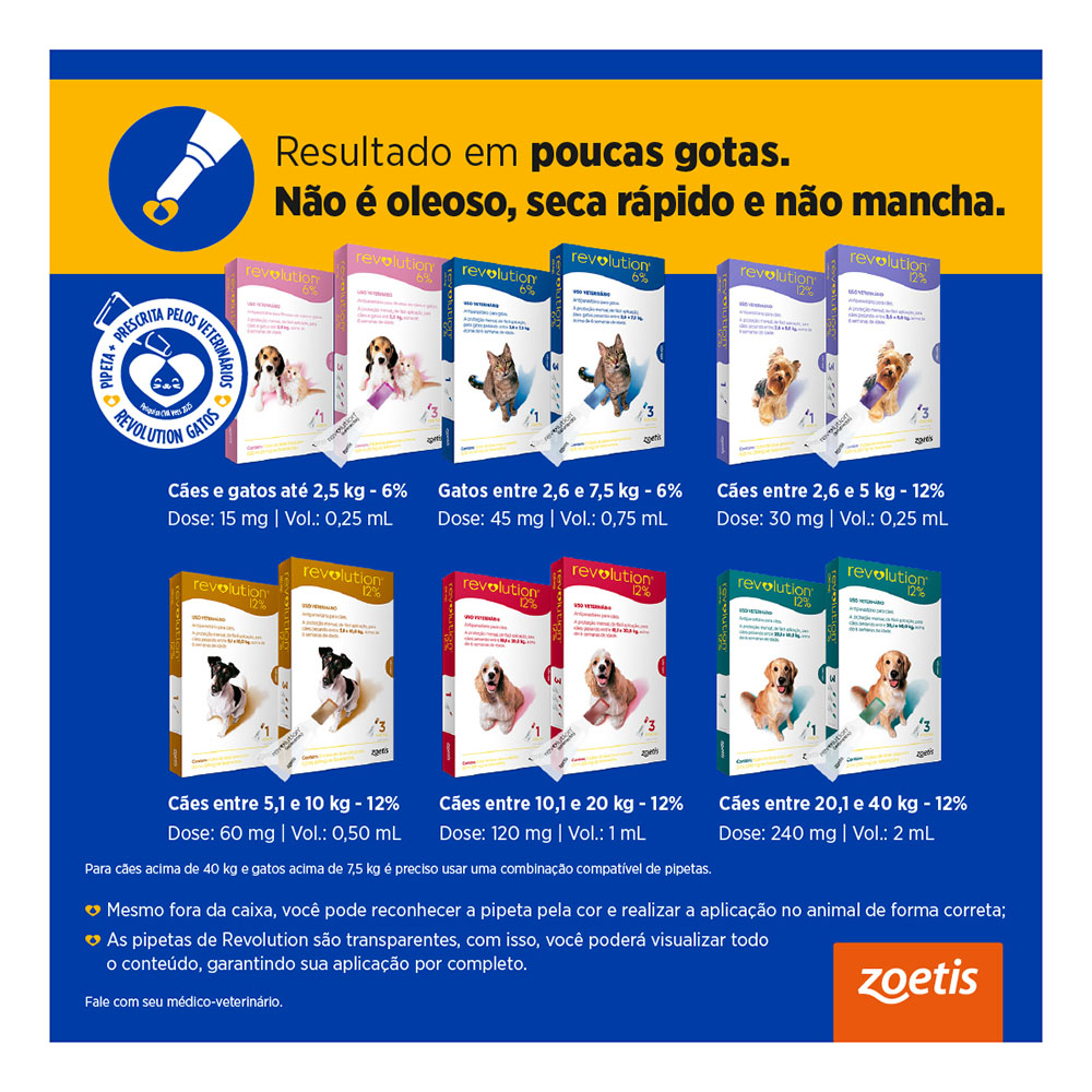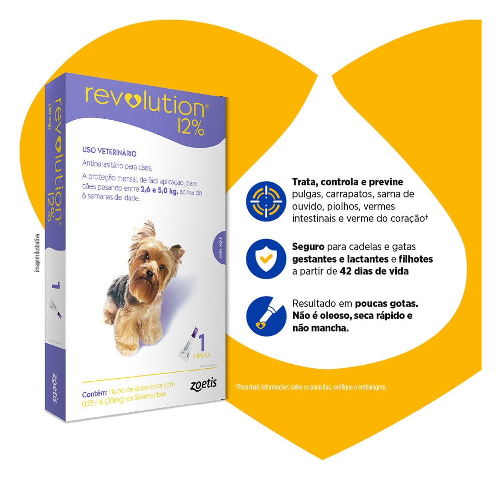 O Antipulgas Revolution 12% 30 mg é indicado para cães a partir de seis semanas, que tenham até 5 kg. É um antiparasitário tópico, desenvolvido pela Zoetis.