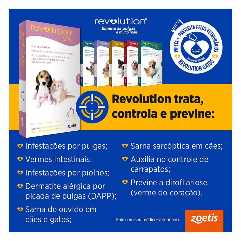 Revolution 12% trata, previne e controla infestações por pulgas, controla a dermatite alérgica por picada de pulgas (DAPP), previne a dirofilariose, trata e controla sarna de ouvidos, sarna sarcóptica em cães, vermes intestinais, infestações por piolhos e é auxiliar no controle de carrapatos em cães.