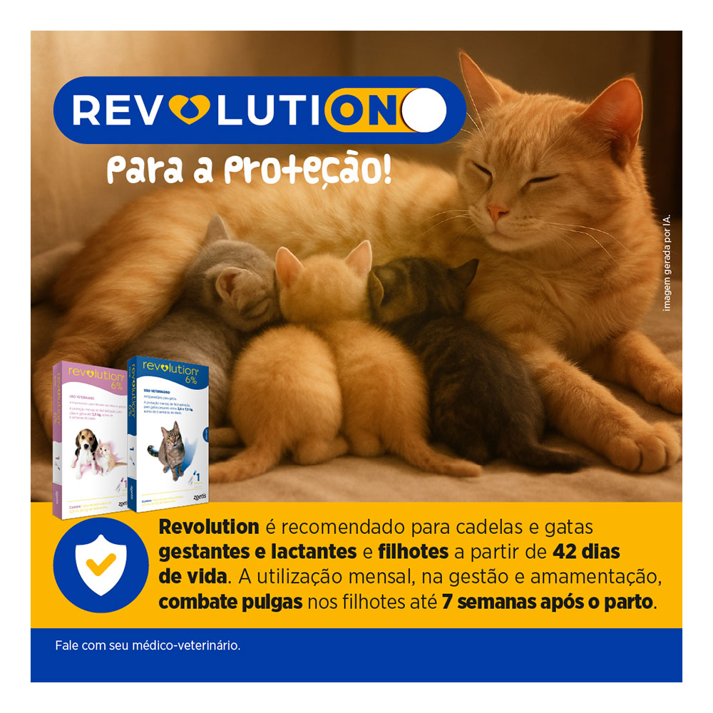 Revolution 12% é aplicado topicamente à pele na dosagem mínima recomendada de 6 mg de Selamectina por kg de peso corporal, uma vez ao mês.