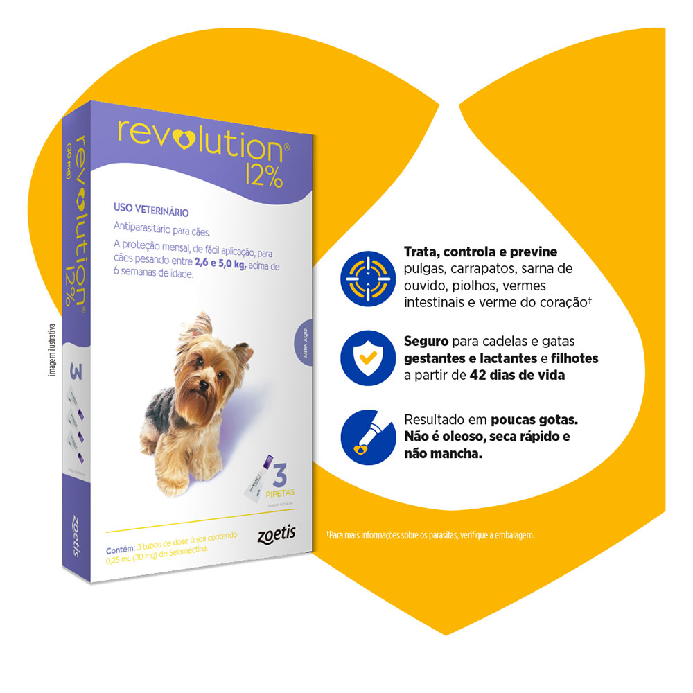 O Antipulgas Revolution 12% 30 mg é indicado para cães a partir de seis semanas, que tenham até 5 kg. É um antiparasitário tópico, desenvolvido pela Zoetis.