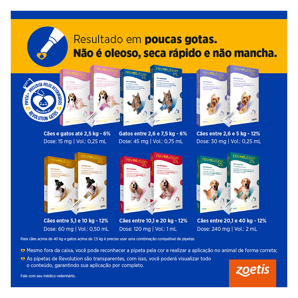 Revolution 12% é aplicado topicamente à pele na dosagem mínima recomendada de 6 mg de Selamectina por kg de peso corporal, uma vez ao mês.