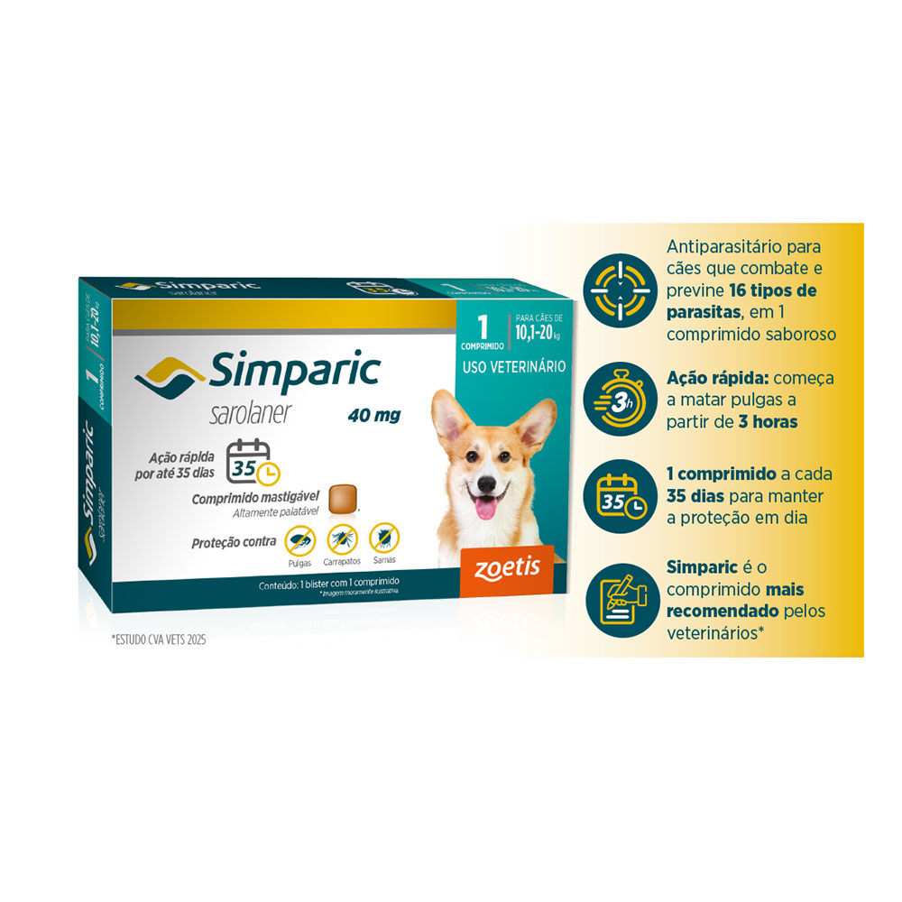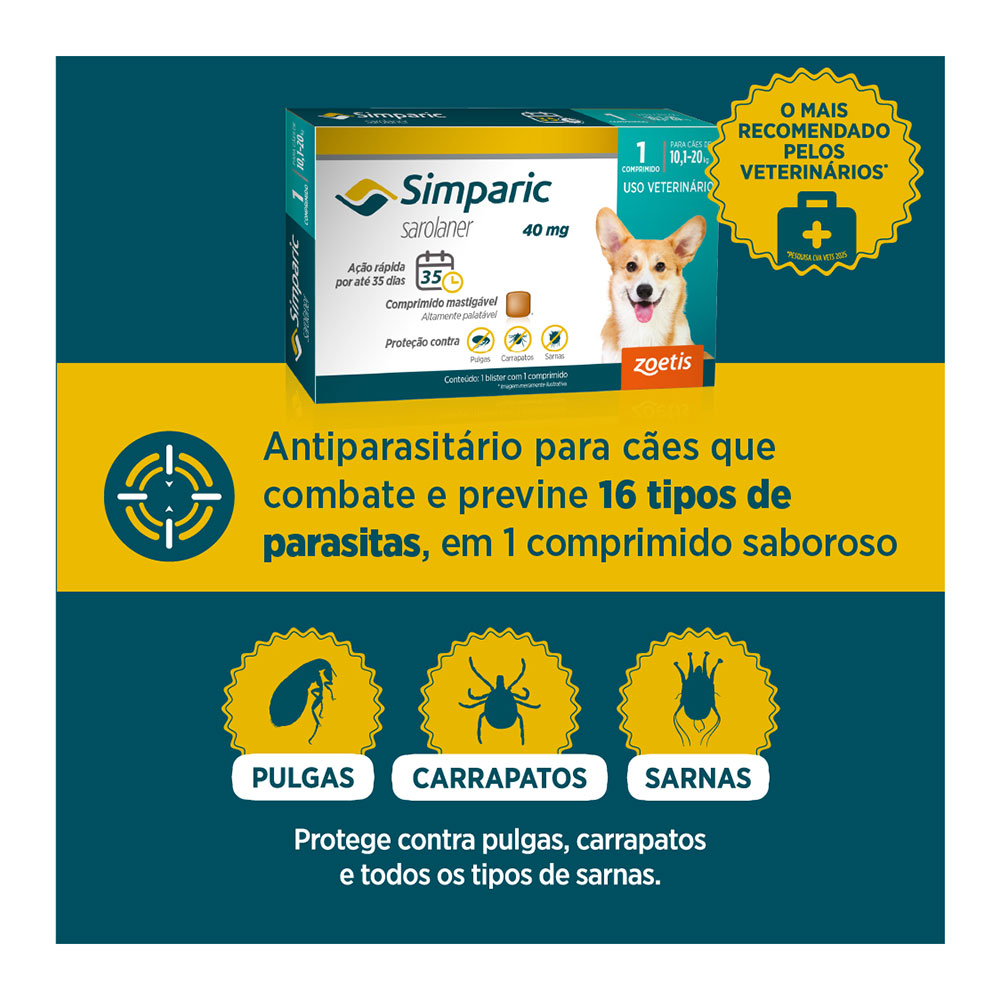 O Antipulgas e carrapatos Simparic 40mg foi desenvolvido para combater as indesejadas pulgas e carrapatos, mantendo sua eficácia por até 35 dias.