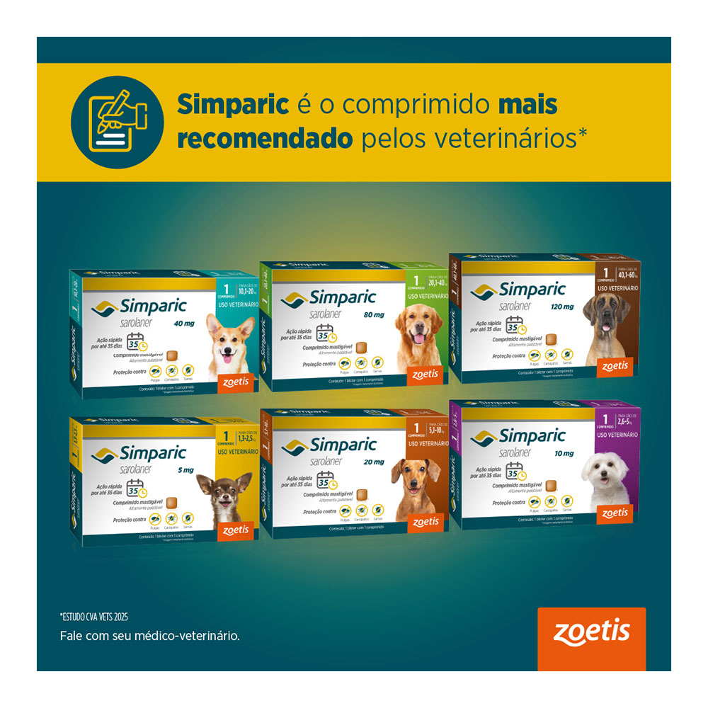 Simparic é eficaz e altamente palatável, ele é indicado para ação contra pulgas, carrapatos e sarnas.