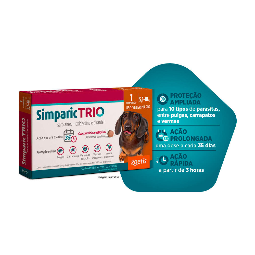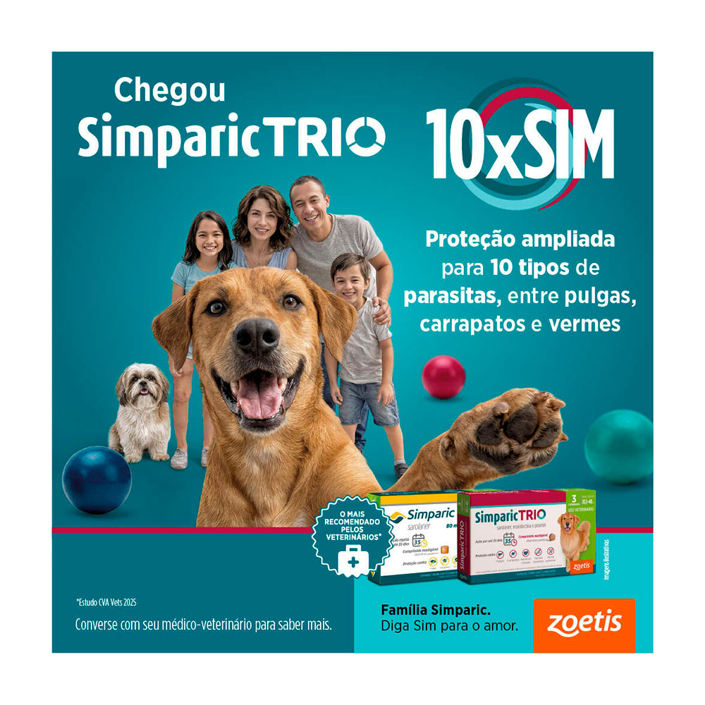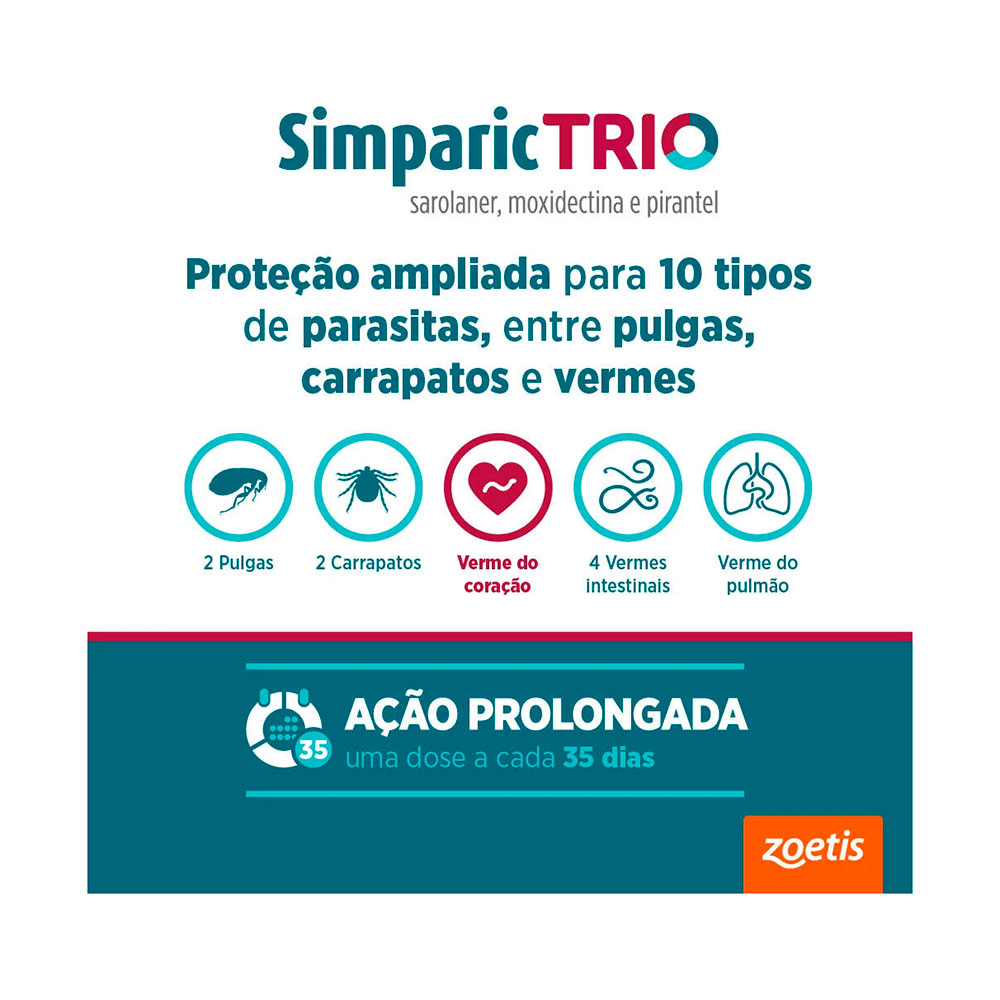 Desenvolvido pela Zoetis, líder mundial em saúde animal, o Simparic Trio combina tecnologia moderna com ação rápida e eficaz, começando a agir em poucas horas após a administração e eliminando parasitas antes que causem infestações mais graves ou transmitam doenças.