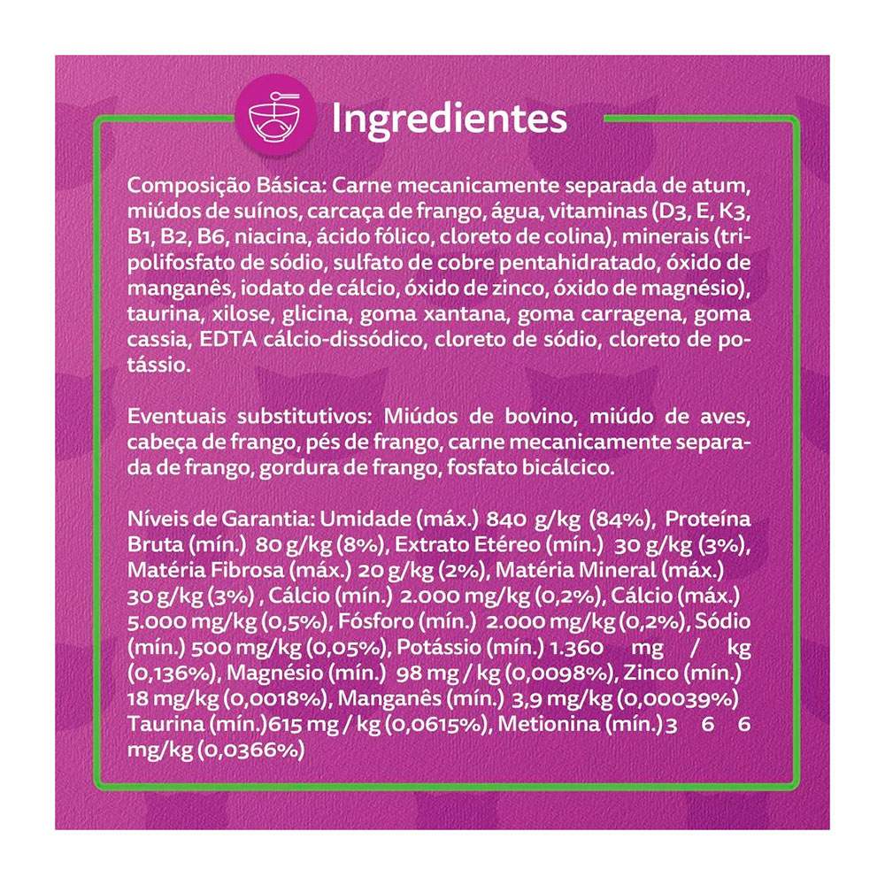 Atum, miúdos de aves, água, minerais (tripolifosfato de sódio, cloreto de potássio, sulfato de cobre, óxido de manganês, iodato de cálcio, óxido de zinco, selenito de sódio, óxido de magnésio), vitaminas (D3, E, B1, B2, B6, B12, ácido pantotênico, niacina, ácido fólico, cloreto de colina), metionina, taurina, goma carragena, goma cássia, goma xantana, EDTA cálcio dissódico, dióxido de titânio, palatabilizante.