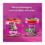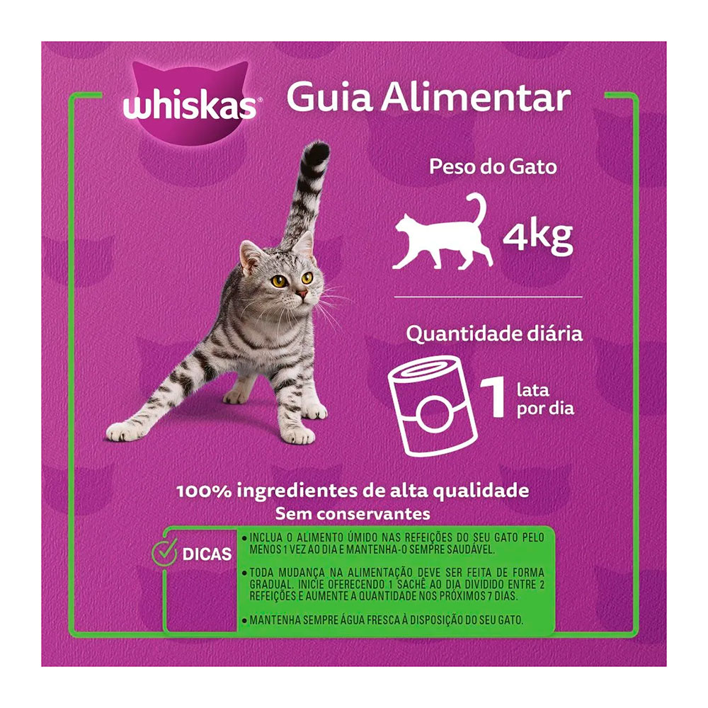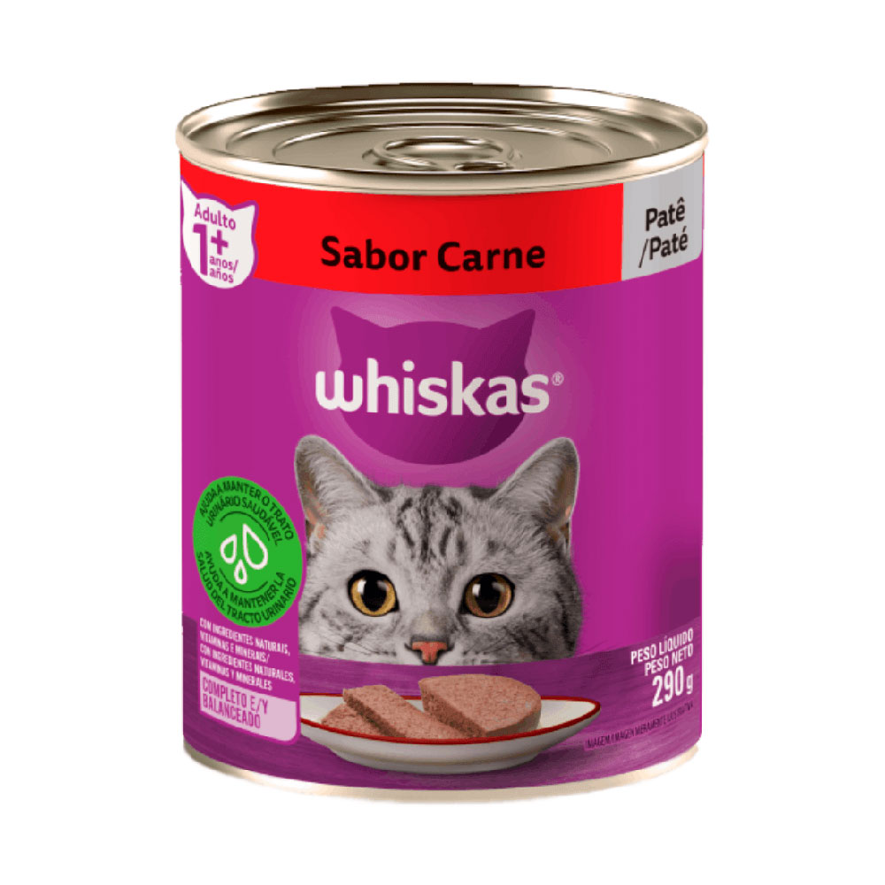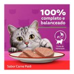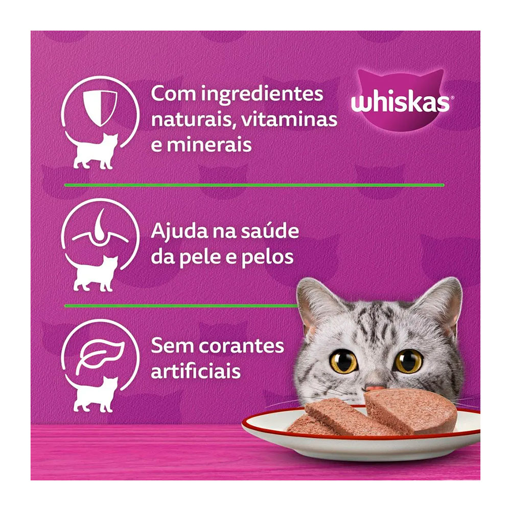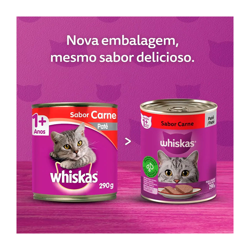 A Ração Úmida Whiskas Patê Carne, um delicioso alimento 100% completa, cozida a vapor, e livre de aromas artificiais.
