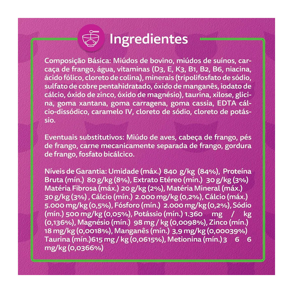 Miúdo de bovino, miúdos de aves, água, minerais (tripolifosfato de sódio, cloreto de potássio, sulfato de cobre, óxido de manganês, iodato de cálcio, óxido de zinco, selenito de sódio, óxido de magnésio), vitaminas (D3, E, B1, B2, B6, B12, ácido pantotênico, niacina, ácido fólico, cloreto de colina), metionina, taurina, goma carragena, goma cássia, goma xantana, corante caramelo, EDTA cálcio dissódico, palatabilizante.