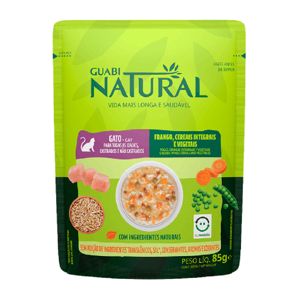Ração Úmida Guabi Natural Sachê Gatos Adultos Frango, Cereais e Vegetais 85g